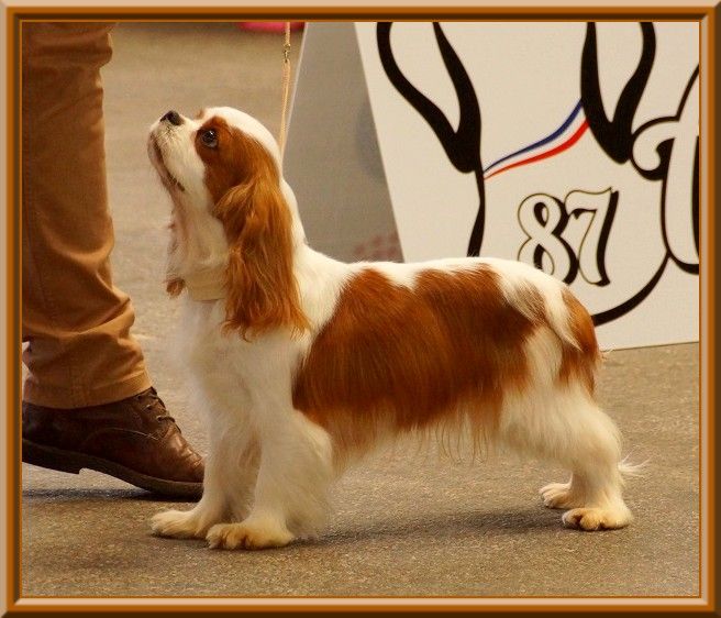 Exc yeux - Exc rapport crâne-chanfrein - Oreilles attachées basse - Très jolie sortie d'encolure - Très bonne poitrine - Bonne longueur de rein - Ex angulations arrières - Fouet bien attaché - La ligne du dessus pas assez tendue aujourd'hui - Bonne couverture de terrain mais fouet un peu timide. Cotation 2 en cours.